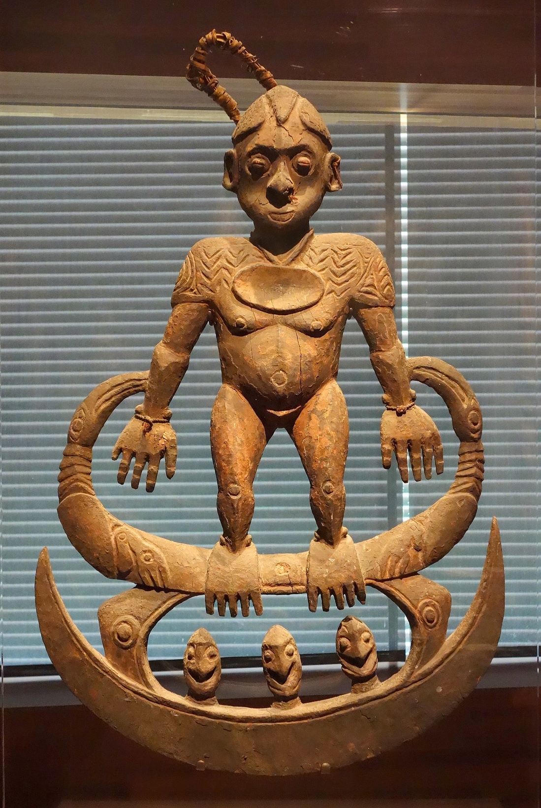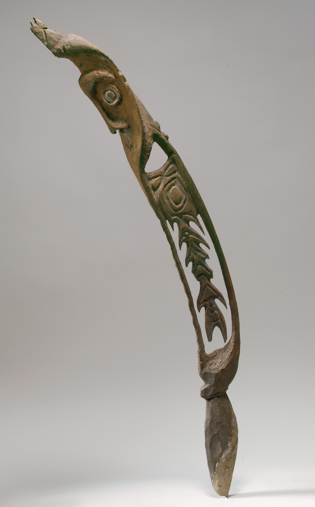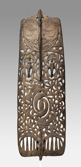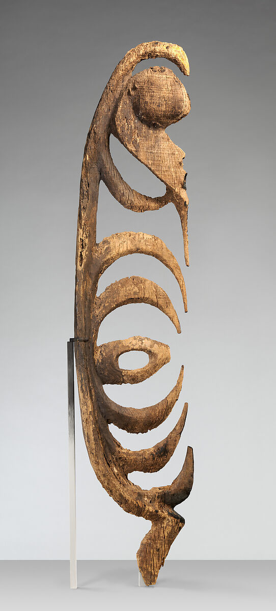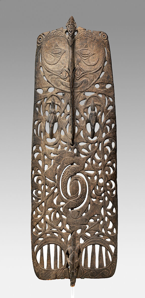 A small human head, possibly that of an ancestor, is depicted at the top. Two smaller birds, modeled in high relief, flank the nose, and the image of a male tusker pig adorns the base. These smaller animal images may represent totemic species associated with the owner's (or artist's) clan. The flowing, sinuous forms of the open designs resemble dense vegetation and are subdivided into a series of teardrop-shaped forms, whose openwork designs are interpreted by some Western observers as highly stylized human faces.' However, such interpretations remain purely speculative.