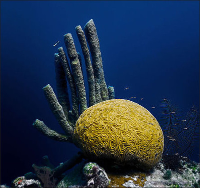 Brain corals, a slow-growing species of coral, often act as foundations for reefs. They can grow six feet tall and live for up to 900 years! Found in the Caribbean, Atlantic, and Pacific Oceans, brain corals display what is known as Meandroid tissue integration. This means that the polyps, which are the basic living unit of corals, are highly associated to one another. Their tissues are more closely connected than those of other corals and are not separated by skeletal structures. Many researchers think that the more integrated a coral's polyp tissue is, the more advanced the coral species. [Source: NOAA]
