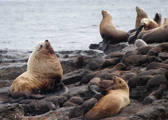 Steller sea lions (Eumetopias jubatus) are the largest of the eared seals, with males weighing as over a tonne. The body length of males is 2.6 to 3.9 meters (8.5 to 12.8 feet); females, up to 2.6 meters (8.5 feet). Males generally weigh around 1100 kilograms (1.2 US tons); females, 270 to 350 kilograms (600 to 770 pounds). Steller sea lions live in coastal waters and offshore islands in the North Pacific, breeding in Kamchatka and Sakhalin Island in Russia and the Pribilof Islands in Alaska. In the eastern Pacific Ocean they are found as far south as southern California. Male Steller sea lions can live up to 20 years; whereas, females can live up to 30 years.