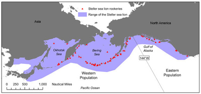 Steller sea lions are considered Endangered west of 144º W latitude and threatened east of 144º W latitude. The western DPS ( distinct population segment) includes Steller sea lions that originate from rookeries west of 144° west longitude (Cape Suckling): those in the Gulf of Alaska, the Aleutian Islands, the Bering Sea, and Asia. The eastern DPS includes sea lions originating from rookeries in southeast Alaska, British Columbia, Washington, Oregon, and California. The two populations of Steller sea lions represent different genetic, morphological, ecological, and population trends. Data show that the foraging ranges of the two DPSs overlap, especially in the non-breeding season. For example, females from the eastern Gulf of Alaska regularly occur in parts of southeast Alaska and males from the eastern DPS have been observed as far north as the Bering Sea. In recent years, a “mixing zone” has also become established in northern southeast Alaska on at least two new rookeries partially established by western DPS females, who left their traditional rookeries during the period of sharp decline in the western population.