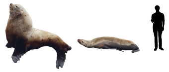 Steller sea lions are the largest member of the family Otariidae, the “eared seals,” which includes all sea lions and fur seals but not true seals, and the fourth largest pinniped in the world after southern elephant seals, northern elephant seals and walruses. Steller sea lions range in weight from 350 to 1,120 kilograms (771 to 2,470 pounds) and range in length from 2.3 to 3.4 meters (7.55 to 11.15 feet). Pups range from 16 to 22.5 kilograms (35 to 50 pounds). [Source: NOAA]
