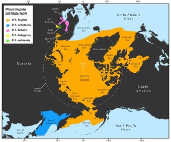Ringed seals are circumpolar and range throughout the Arctic Basin and southward into adjacent seas, including the Bering and Labrador Seas, ranging from 35°N, to the North Pole. They are also found in the Sea of Okhotsk and Sea of Japan in the western North Pacific and the Baltic Sea in the North Atlantic. Landlocked populations inhabit Lakes Ladoga (Russia) and Saimaa (Finland). [Source: NOAA]