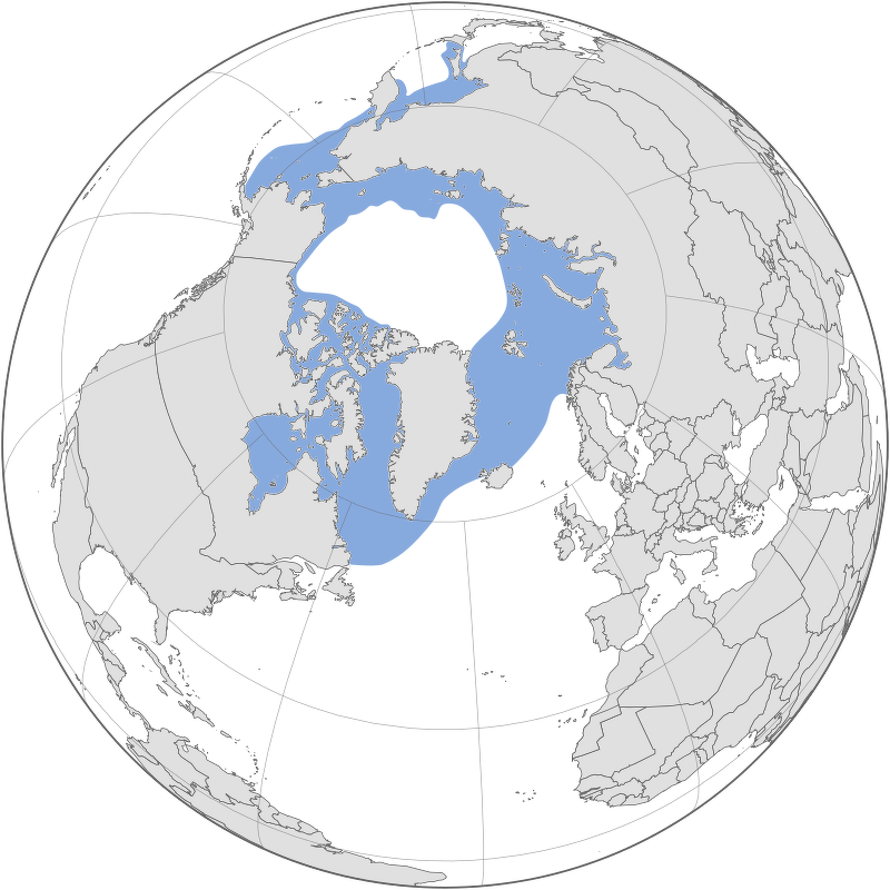 Bearded seal populations are geographically divided into two subspecies: 1) Eastern bearded seals (E. barbatus barbatus) and 2) Western bearded seals ( E. barbatus nauticus). Eastern bearded seals occupy parts the Arctic near the Atlantic Ocean, from the eastern Canada at the Gulf of Saint Lawrence to the waters around Norway. Western bearded seals reside in the Sea of Okhotsk and Bering Sea, and in areas of the Arctic Ocean not occupied by Eastern bearded seals. Bearded seals are often sighted as far south as Hokkaido, Japan. There have been sightings of Western bearded seals in China and of Eastern bearded seals in Portugal. It currently unknown why some animals travel so far south outside their normal range.[Source: Anthony Neuberger; Laurel Popplewell; Hillary Richardson, Animal Diversity Web (ADW) |=|]