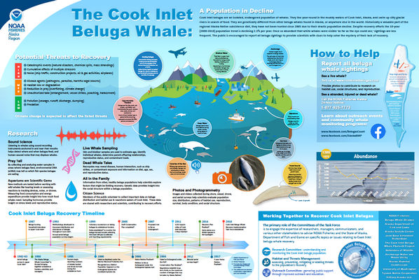 Ocean Noise: Underwater noise pollution interrupts the normal behavior of beluga whales, which rely on sound to communicate and echolocate. If loud enough, noise can cause permanent or temporary hearing loss. This is of particular concern for the Cook Inlet population, which inhabits an area with high vessel traffic, oil and gas exploration and development, dredging and pile-driving, military operations, and other noise-making anthropogenic (human-caused) activities.