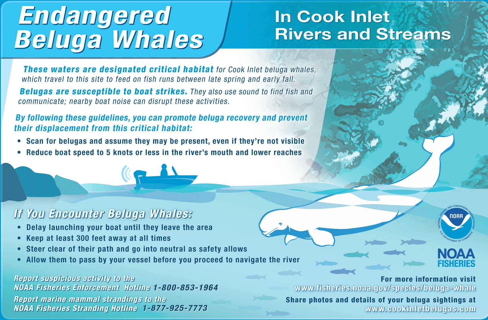 Threats to beluga whales include ocean noise, strandings, food limitations, pollution (such as, heavy metals, chemicals, trash), shipping, extreme weather events, subsistence harvesting, natural predators (polar bears and killer whales), contamination of rivers (as with polychlorinated biphenyl (PCBs) which bioaccumulate up the food chain), climate change, infectious diseases, habitat degradation, harassment, interactions with commercial and recreational fisheries, oil and gas exploration, and other types of human disturbance such as underwater noise. The threat of capturing beluga whales for the aquarium trade remains. Humans also pose a threat to belugas through the expansion of communities along the coast that affect beluga feeding areas and migration patterns. The Cook Inlet population faces additional threats because of its proximity to the most densely populated area of Alaska (Anchorage) during the summer season. [Source: NOAA]