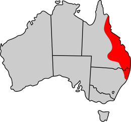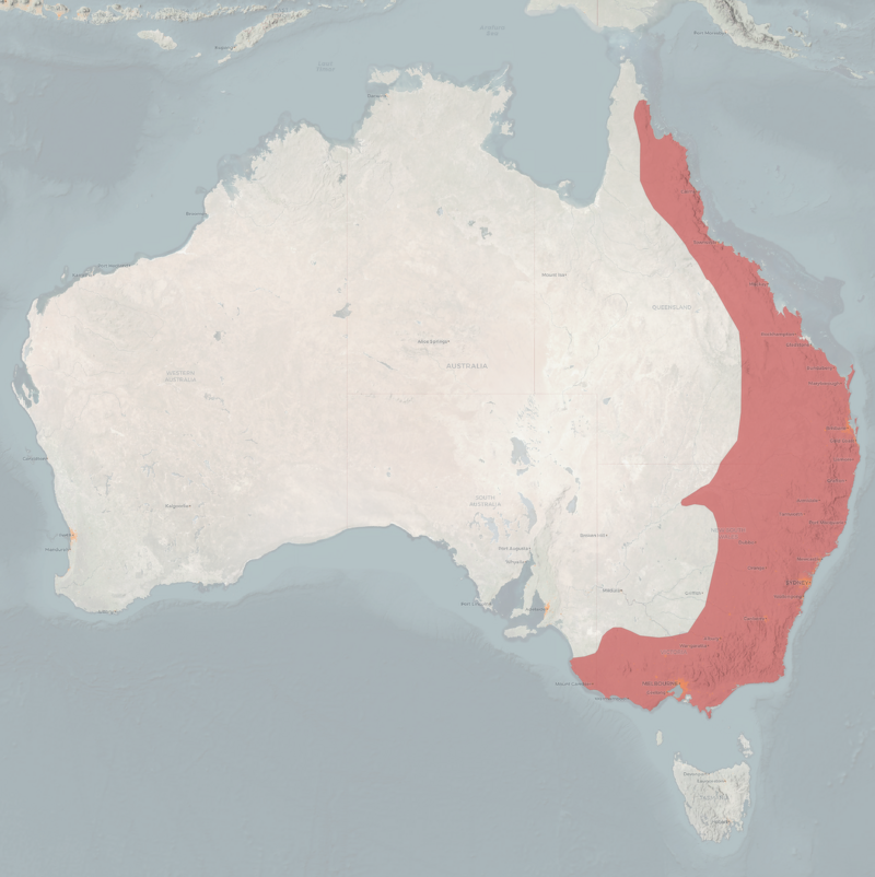 Swamp wallabies live on the eastern coast of Australia in southeastern South Australia, Victoria, eastern Queensland, and eastern New South Wales. They generally live in, but are not restricted to, dense forests, woodlands, and swampy areas. They are known to venture into more open areas, but only if there are nearby areas of thick brush.[Source: Jennifer Ellis, Animal Diversity Web (ADW) |=|]