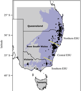 Brush-tailed rock-wallabies (Petrogale penicillata) are also called small-eared rock-wallabies. They inhabit rock piles and cliff lines along the Great Dividing Range from about 100 kilometers north-west of Brisbane to northern Victoria, in vegetation ranging from rainforest to dry sclerophyll forests. Populations have declined seriously in the south and west of its range, but they remains locally common in northern New South Wales and southern Queensland. However, due to a large bushfire event in South-East Australia around 70 percent of all the wallaby's habitat had been lost as of January 2020. In 2018, the southern brush-tailed rock wallaby was declared the official mammal emblem of the Australian Capital Territory (ACT), although it has not been seen in the wild in the ACT since 1959. [Source: Wikipedia]