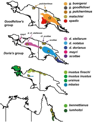 Twelve of the 14 known species including a couple that have only been discovered relatively recently, live in New Guinea, both in Papua New Guinea and West Papua in Indonesia, and some nearby islands, namely the Biak (Schouten) Islands and the Raja Ampat Islands near West Papua, Indonesia. Two species live in Australia.