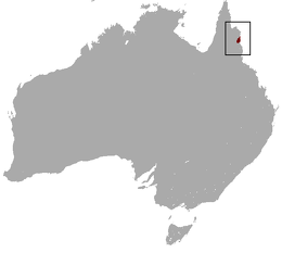 Lumholtz’s tree-kangaroos inhabit an area of approximately 5,500 square kilometers (2,123 square miles) in Northeast Queensland, Australia. Their range extends from the Daintree River in the north to the southern end of Cardwell Range in the south, where rainforest and wet sclerophyll forest interface in the west and the coast in the east. Their greatest concentrations are in the fragmented forests of the Atherton tablelands.