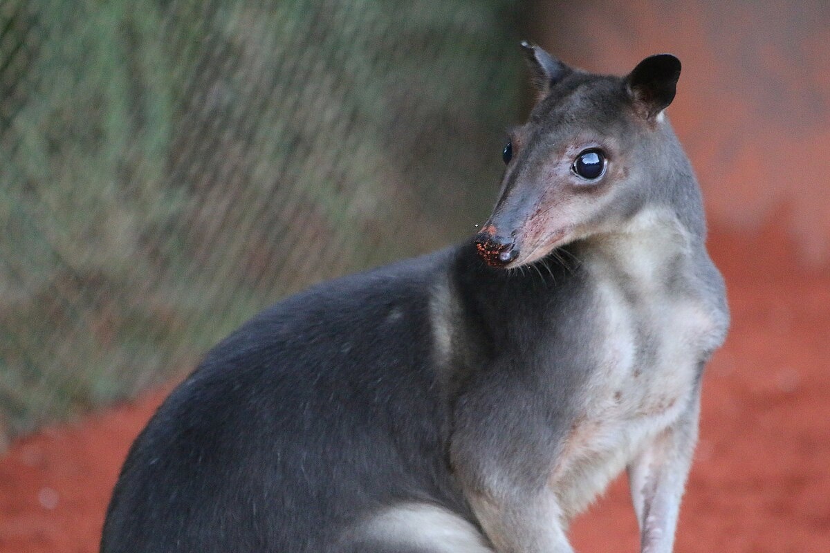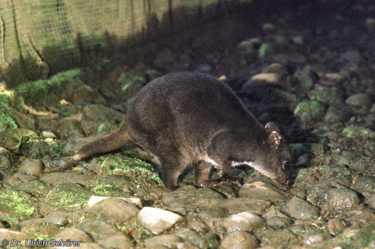 Gray forest wallabies(Dorcopsis luctuosa) are also known as gray dorcopsis. They are found in the southeastern part of New Guinea in West Papua, Indonesia and Papua New Guinea in tropical primary and secondary forest, in particular gallery forest, but also in disturbed areas such as abandoned gardens, at altitudes of up to 400 meters (1,300 feet). [Source: Wikipedia . Gray forest wallabies have a long muzzle and small, rounded ears. The forelegs are relatively long in comparison to their hind legs,The tail is long and has a bare, cornified tip. The short, dense fur is smoky-grey above and paler grey beneath, with a yellowish patch around the single cloacal orifice.