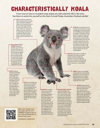 According to Animal Diversity Web (ADW): Koalas have a large, bulbous nose. Their ears are large and rounded. Their marsupium (pouch) is well developed, opens to the rear, and contains only two teats. Their stomachs are unusual, long and folded and with a unique gastric gland. Koalas also have an enormous cecum (a pouch connected to the junction of the small and large intestines), which helps them digest eucalyptus leaves [Source: Phil Myers, Animal Diversity Web (ADW) |=|]