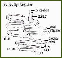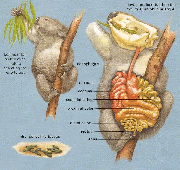 Koalas tend feed at night. An adult koala can eat 500 grams daily. Adaptions for their specialized, high fiber, low protein diet include a large cecum, up to four times their body length, and cheek pouches, along with dentition highly developed for grinding plant cells. The cheek teeth are reduced to a single premolar and four broad, highly cusped molars on each jaw which finely grind the leaves for easier digestion ." The cecum, which sits at the junction of small and large intestines, is where microbial fermentation takes places, augments the koala's digestive processes). Al these things help koalas process large amounts of fibrous forage. The koala diet has been compared with what it would be like to eat of box museli without the museli. Human subsisting only a diet of eucalyptus leaves would die of liver failure. [Source: Jennifer Dubuc and Dana Eckroad, Animal Diversity Web (ADW) |=|]