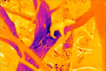 thermal image showing how tree hugging affected koala body temperature; purple tones are the coldest; yellow colors indicating warmth; Orange tones show temperatures in between those two extremes; trees gain heat from the koala body; when this happens, koalas cools off; from University of Melbourne