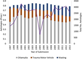 Total counts and proportions of aetiologies Chlamydia-like signs, trauma caused by motor vehicles, and wasting occurring in koalas submitted to wildlife hospitals in SEQLD from 1997–2013, from nature