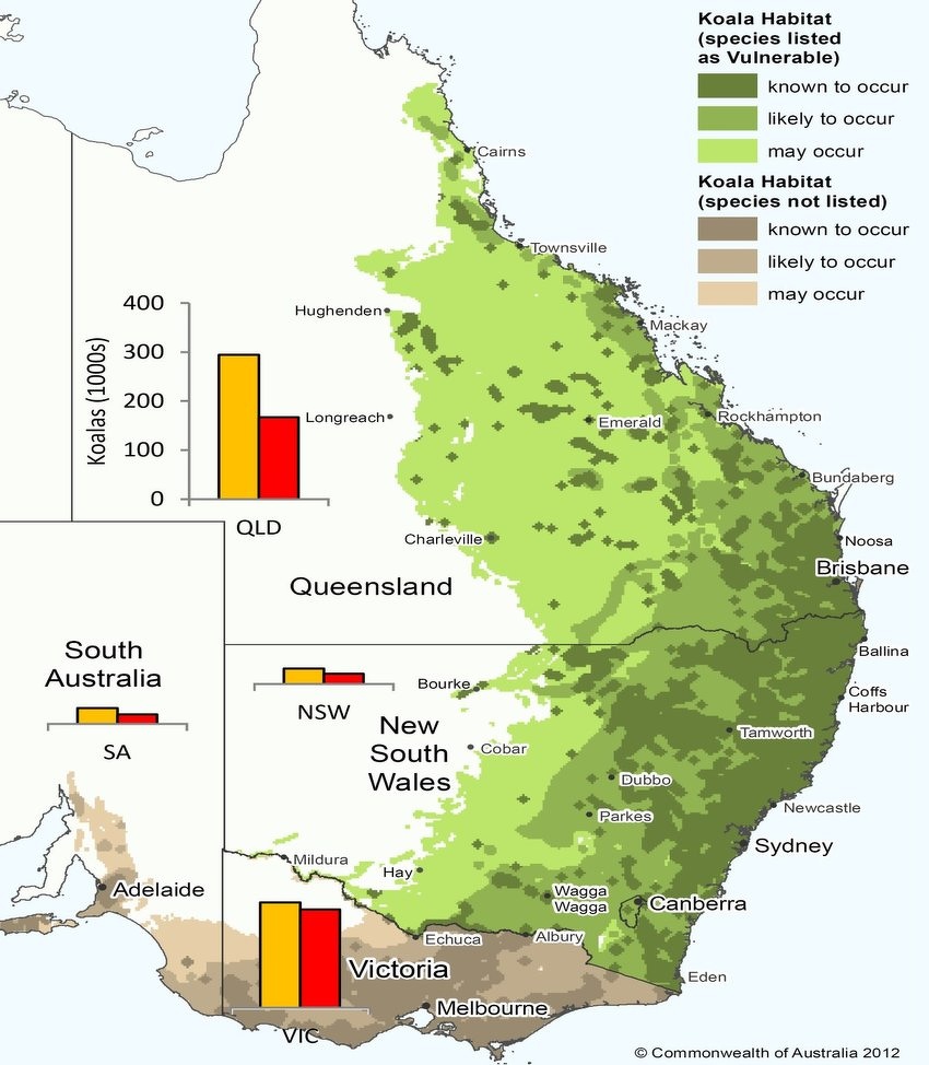 Distribution and abundance of koalas; Inset bar charts show Australian Government estimated abundance (in thousands) of koalas in each state in 1990 and 2010; Green shading shows jurisdictions in which koalas are listed as vulnerable to extinction, whereas brown shading shows jurisdictions in which they are not listed (Department of the Environment and Energy 2012; Researchgate)
