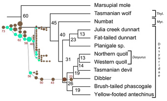 Phylogeny of Dasyuromorphia based on complete mt genomes; Phylogenomic relationships among dasyuromorphian subfamilies, including the position of the Tasmanian devil, based on complete mitochondrial genomes; The numbers in black at the nodes of the tree are divergence times calculated from a 44-taxon matrix using a combined set of 13 fossil calibration points; The circles plotted beside the tree are the results of a COSEG analysis of the 66 subfamilies of WSINE1; Brown circles indicate different subfamilies and blue circles the subfamilies that gave rise to new subfamilies; The red numbers beside the circles indicate the estimated evolutionary age for selected subfamilies; Thyl: Thylacinidae; Myr: Myrmecobiidae