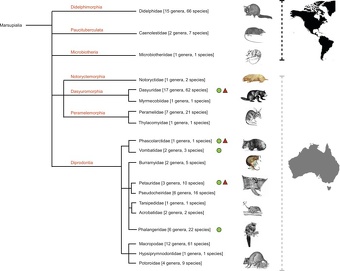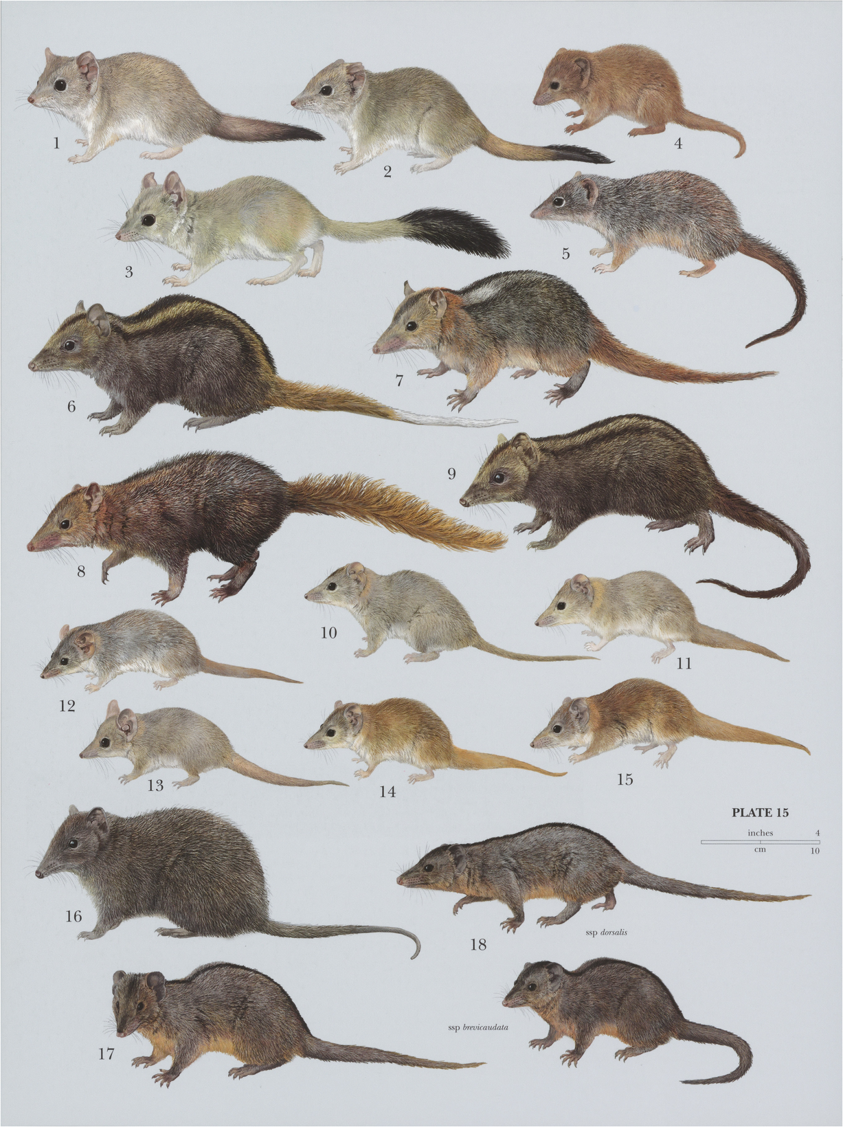 Some Dasyurid species: 2) Crest-tailed Mulgara (Dasycercus cristicauda); 3) Kowari (Dasyuroides byrnei); 4) Kaluta (Dasykaluta rosamondae); 5) Dibbler (Parantechinus apicalis); 6) Woolley's Three-striped Dasyure (Myoictis leucura); 7) Miller's Three-striped Dasyure (Myoictis melas); 8) Wallace's Three-striped Dasyure (Myoictis wallacii); 9) Tate's Three-striped Dasyure (Myoictis wavicus); 10) Sandstone Pseudantechinus (Pseudantechinus bilarni); 11) Fat-tailed Pseudantechinus (Pseudantechinus macdonnellensis); 12) Carpentarian Pseudantechinus (Pseudantechinus mimulus); 13) Ningbing Pseudantechinus (Pseudantechinus ningbing); 14) Rory’s Pseudantechinus (Pseudantechinus roryi); 15) Woolley's Pseudantechinus (Pseudantechinus woolleyae); 16) Speckled Dasyure (Neophascogale lorentzii); 17) Red-bellied Phascogale (Phascolosorex doriae); 18) Narrow-striped Dasyure (Phascolosorex dorsalis))