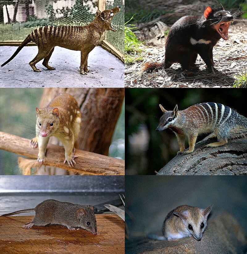Dasyuromorphs (clockwise from upper left): 1) Tasmanian wolf; 2) Tasmanian devil; 3) Tiger quoll; 4) Numbat; 5) Yellow-footed-antiechinus; 6) Fat-tailed dunnart