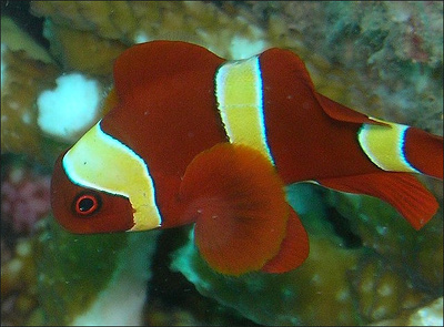 Maroon clownfish are monogamous and mated pairs may stay together for several years. Reproduction is external, meaning the male’s sperm fertilizes the female’s egg outside her body. They are also sequential hermaphrodites in which individuals change their sex at some point in their lives and typically produces eggs and sperm at different stages their lives. In the case of maroon clownfish, males may be half the size of females and their gonads have dormant ovarian cells as well as functioning testes. [Source: Johanna Higuera, Animal Diversity Web (ADW) /=]