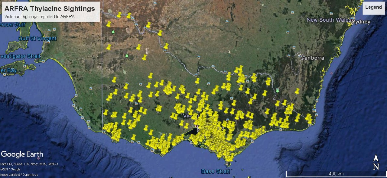 Locations of Tasmanian wolf sightings in Victoria on the Australian mainland according to the Thylacine Awareness Group of Australia