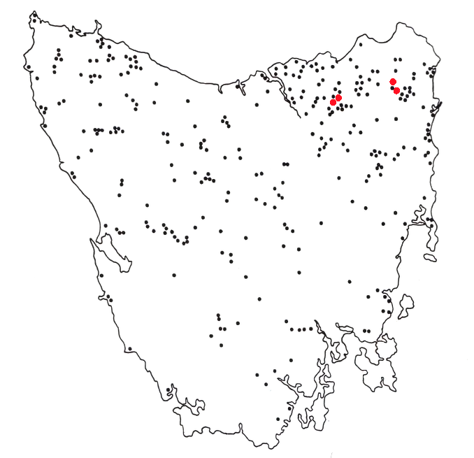 Map of the locations of reported sightings of Tasmanian wolves between 1936 and 1980 in Tasmania: one reported sighting (black);