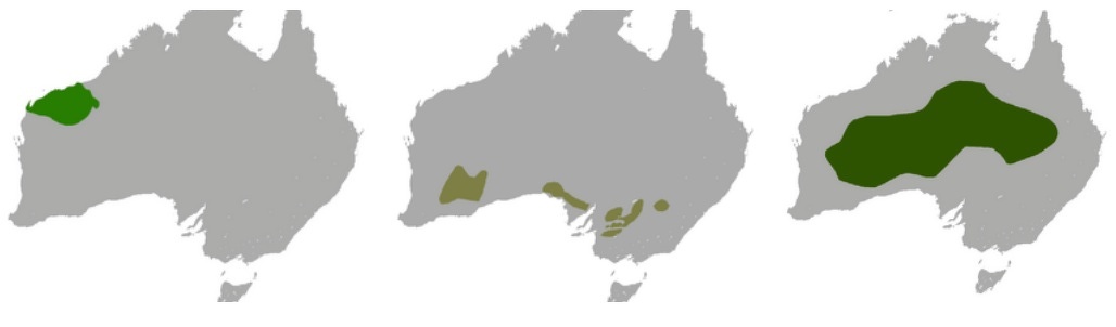 range of three Ningaui species: Pilbara ningaui (left); Southern ningaui (middle) and Wongai ningaui (right)