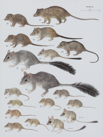 Planigales and fairly close relatives: 41) Short-furred Dasyure (Murexia longicaudata); 42) Broad-striped Dasyure (Murexia rothschildi); 43) Long-nosed Dasyure (Murexia naso); 44) Red-tailed Phascogale (Phascogale calura); 45) Northern Brush-tailed Phascogale (Phascogale pirata); 46) Common Brush-tailed Phascogale (Phascogale tapoatafa); 47) Giles's Planigale (Planigale giles); 48) Long-tailed Planigale (Planigale ingrami); 49) Common Planigale (Planigale maculata); 50) Papuan Planigale (Planigale novaeguineae); 51) Narrow-nosed Planigale (Planigale tenuirostris); 52) Wongai Ningaui (Ningauiride); 53) Pilbara Ningaui (Ningaui timealeyi); 54) Southern Ningaui (Ningaui yvonneae); 55) Kultarr (Antechinomys laniger)