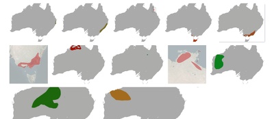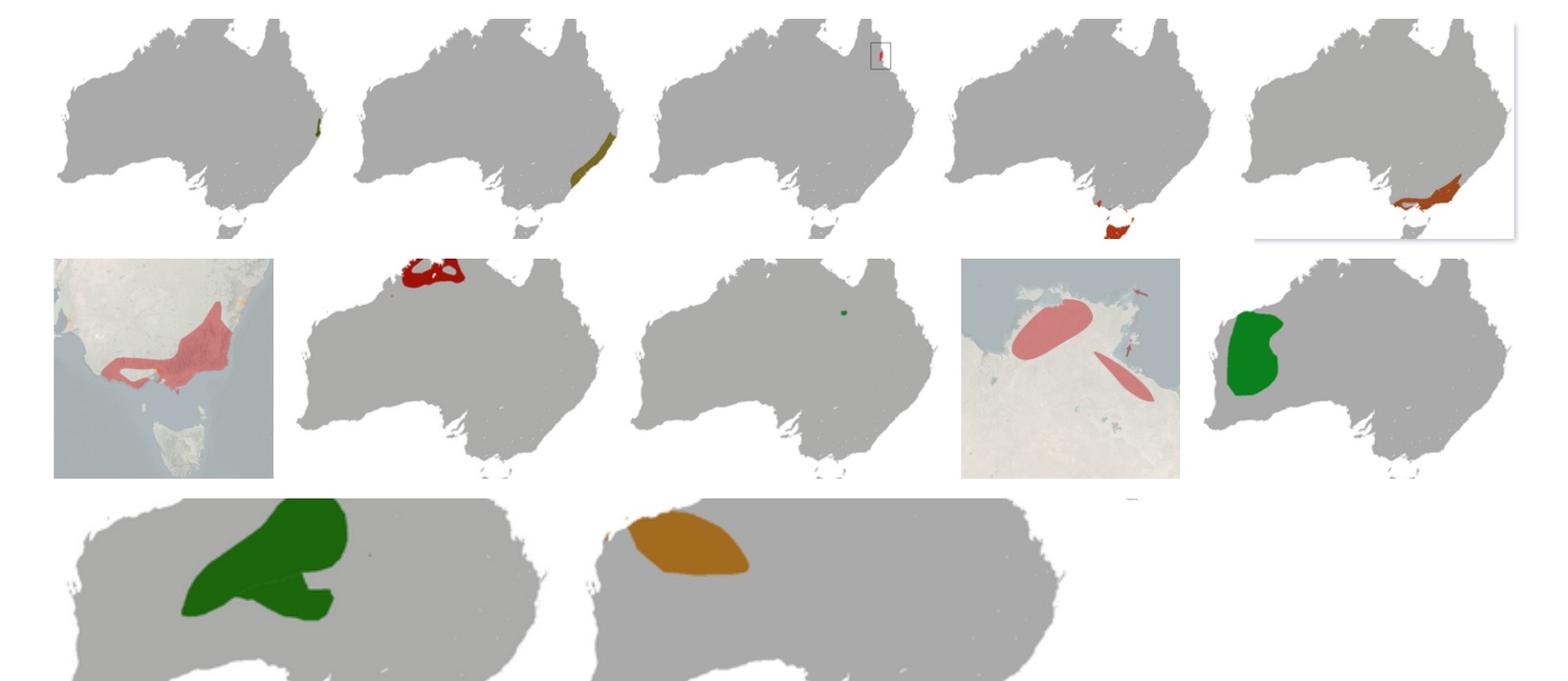 Middle row left to right: 1) Agile Antechnius IUCN Range; 2) Ningbing False Antechinus; 3) Alexandria False Antechinus; 4) Sandstone False Antechinus IUCN Range; 5) Woolley's False Antechinus (Pseudantechinus woolleyae)