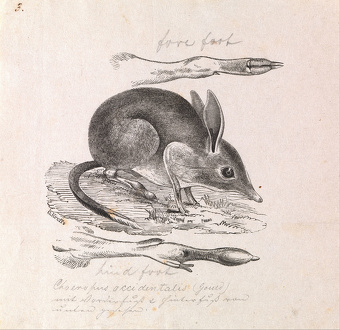 Pig-footed bandicoots get their common name from their feet, which are kind of like those of a pigs, They received their scientistic name — Chaeropus ecaudatus, which means a "tailless pig-foot" — after the discovery of a specimen that had lost its tail, perhaps in a fight with another pig-footed bandicoot. The scientist who described it assumed it was tailless, when, in fact, it the longest tail of all bandicoots. When the mistake was recognized it was too late to rename it.[Source: Rebecca V. Normile, Animal Diversity Web (ADW) |=|]