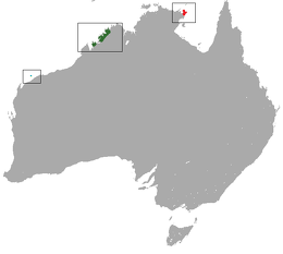 Golden bandicoots occupy a variety of habitats — dry savannahs, acacia or eucalyptus overstory, vine thickets, coastal scrub areas, rainforest margins and sometimes occupy rocky, sandstone and spinifex areas. There are several recognized subspecies: 1) Isoodon auratus auratus, also known as mainland golden bandicoots, which reside in the Kimberley region of Western Australia and on three of the Wessel Islands in Northern Territories: Marchinbar, Raragala, and Guluwuru Islands; 2) Isodon auratus barrowensis, or Barrow Island golden bandicoots, which are found on Augustus, Barrow and Middle Islands off Western Australia. [Source: Molly Norlin, Animal Diversity Web (ADW) |=|]