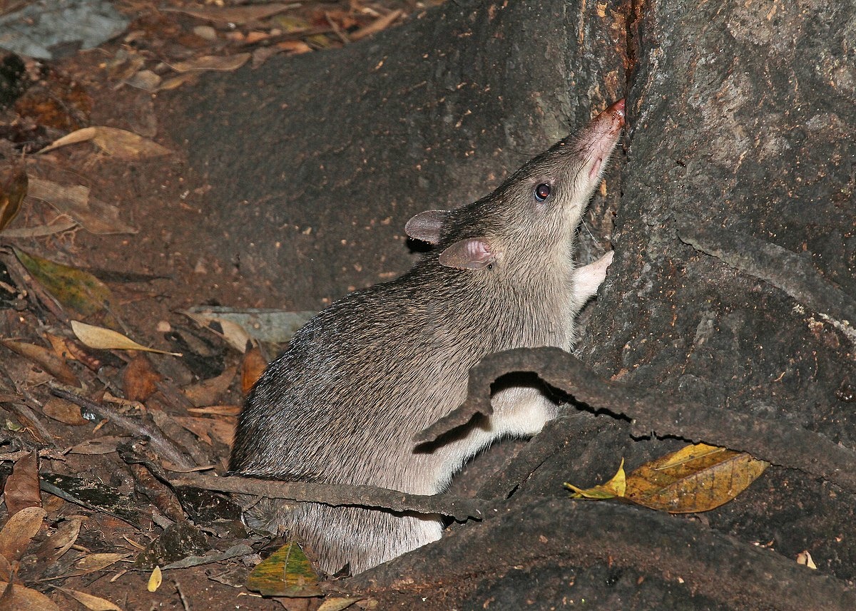 Northern brown bandicoots are extremely vigilant and move around quite a bit when active. Troy Szaura wrote in Animal Diversity Web: Movement patterns during activity are rather variable over consecutive nights. Males exhibit a patrolling pattern throughout the majority of its home range, while female bandicoots do not, resulting in greater home ranges for males. However, this sex specific behavior is said to be too infrequent to resemble territoriality and more likely stems from wanting to become more familiar with the habitat. Foraging is done in a smaller portion of the home range of Northern brown bandicoots, termed the core area. Contact with other bandicoots can arouse individuals to a higher level of activity, likely due to an interest in the other individual, while excessive contact can lead to a decrease in activity due to negative experiences. Typically, northern brown bandicoots spend most of their time alone. |=|