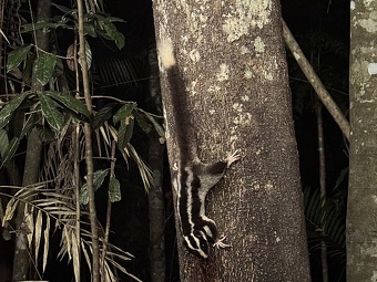 Striped possums are most active from 9:00pm to 05:50am and may spend up to nine hours foraging each night. They forages in trees of different sizes, ranging from 10 centimeters in diameter to 110 centimeters in diameter. Striped possums looks for food on living trees, dead snags, downed trees, and rotting logs in forests, but are occasionally observed feeding in adjacent openlands as far as 400 meters from the edge of the woods. They climb up into the canpy as high as 33 meters in their serach for food. While foraging, striped possums move rapidly through the canopy jumping from limb to limb, sometimes leaping considerable distances. Striped possums have a lithe gait and their limb movement have a distinct 'rowing' motion. Striped possums are quite noisy when feeding. They rustle through the leaves, scratch and snort. When they feed a lot of stuff falls to the forest floor and loud sound of chewing and slurping can be heard.