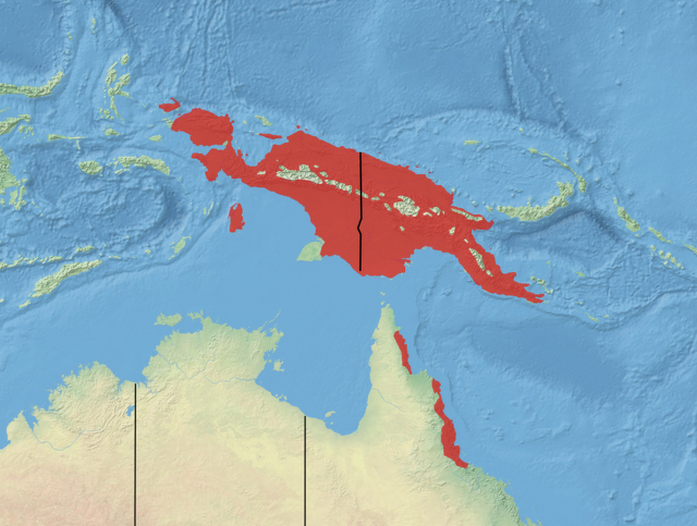 Striped possums inhabit Australia and New Guinea, including some nearby islands. In Australia they are found in northeastern Queensland, from the tip of the Cape York Peninsula in the north to Mt. Spec in the south. They are widespread over this limited range, but is quite rare. In New Guinea they are much more common and distributed throughout the lowlands and foothills. Striped possums live in trees and reside almost exclusively in lowland tropical rainforest and adjacent woodlands at elevations below 300 meters (984 feet). Within this habitat, they are most common in vine forests, riparian (near a river) woodlands, and monsoonlands. Individuals are sometimes observed feeding in more open eucalypt (Eucalyptus species) and melaleuca woodlands. [Source: Lucas Langstaff, Animal Diversity Web (ADW) |=|]
