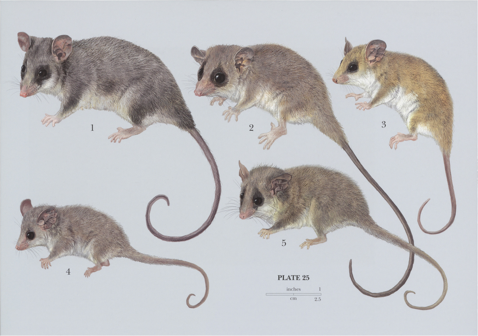 Pygmy Possum Species: 1) Mountain Pygmy Possum (Burramys parvus), 2) Long-tailed Pygmy Possum (Cercartetus caudatus), 3) Western Pygmy Possum (Cercartetus concinnus), 4) Little Pygmy Possum (Cercartetus lepidus), 5) Eastern Pygmy Possum (Cercartetus nanus)