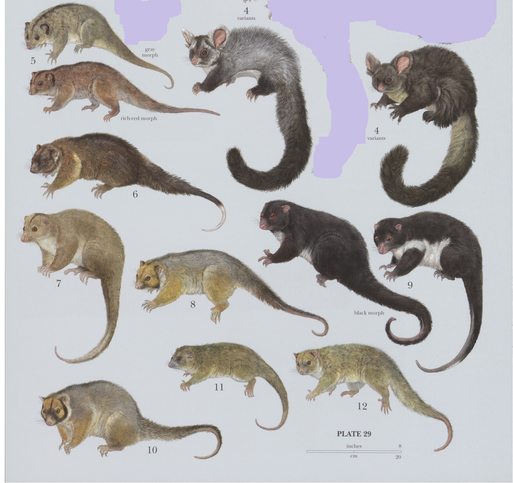 Some Possum species: 4) Southern Greater Glider (Petawroides volans), 5) Lowland Ring-tailed Possum (Pseudochirulus canescens), 6) Weyland Ring-tailed Possum (Pseudochirulus carols), 7) Daintree River Ring-tailed Possum (Pseudochirulus cinereus), 8) Painted Ring-tailed Possum (Pseudochirulus forbesi), 9) Herbert River Ring-tailed Possum (Pseudochirulus herbertensis), 10) Masked Ring-tailed Possum (Pseudochirulus larvatus), 11) Pygmy Ring-tailed Possum (Pseudochirulus mayer), 12) Arfak Ring-tailed Possum (Pseudochirulus schlegeli)