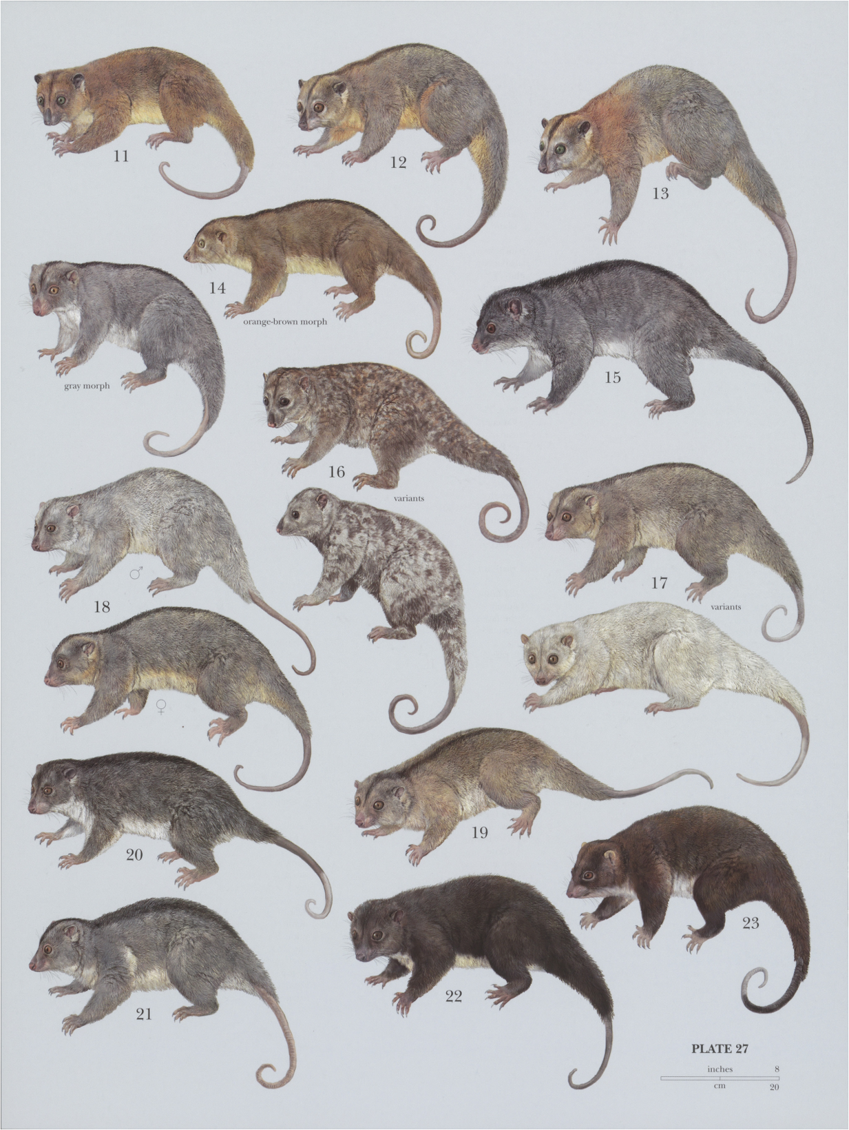 Cuscus species: 11) Peleng Cuscus (Phalanger pelengensus), 12) Moluccan Cuscus (Phalanger ornatus), 13) Gebe Cuscus (Phalanger alexandrae), 14) Obi Cuscus (Phalanger rothschildi), 15) Ground Cuscus (Phalanger gymnotis), 16) Woodlark Cuscus (Phalanger lullulae), 17) Northern Common Cuscus (Phalanger orientalis), 18) Eastern Common Cuscus (Phalanger intercastellanus), 19) Southern Common Cuscus (Phalanger mimicus), 20) Telefomin Cuscus (Phalanger matanim), 21) Stein’s Cuscus (Phalanger vestitus), 22) Silky Cuscus (Phalanger sericeus), 23) Mountain Cuscus (Phalanger carmelitae), 24) Black Spotted Cuscus (Spilocuscus rufoniger), 25) Waigeo Spotted Cuscus (Spilocuscus papuensis), 26) Admiralty Spotted Cuscus (Spilocuscus kraemeri), 27) Blue-eyed Spotted Cuscus (Spilocuscus wilsoni), 28) Common Spotted Cuscus (Spilocuscus maculatus), 29) Australian Spotted Cuscus (Spilocuscus nudicaudatus)