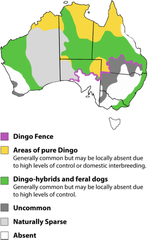 Dingoes and close relatives are common throughout Australia and in scattered groups across Southeast Asia. The primary wild populations are found in Australia and Thailand, though groups have been located in Myanmar, Southeast China, Laos, Malaysia, Thailand, Indonesia, Borneo, the Philippines and New Guinea. [Source: Mary Hintze, Animal Diversity Web (ADW) |=|]
