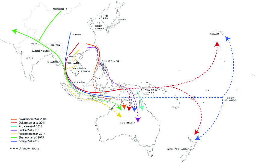 Map depicting possible phylogeographic origins of dingoes, based on genetic evidence, from Researchgate