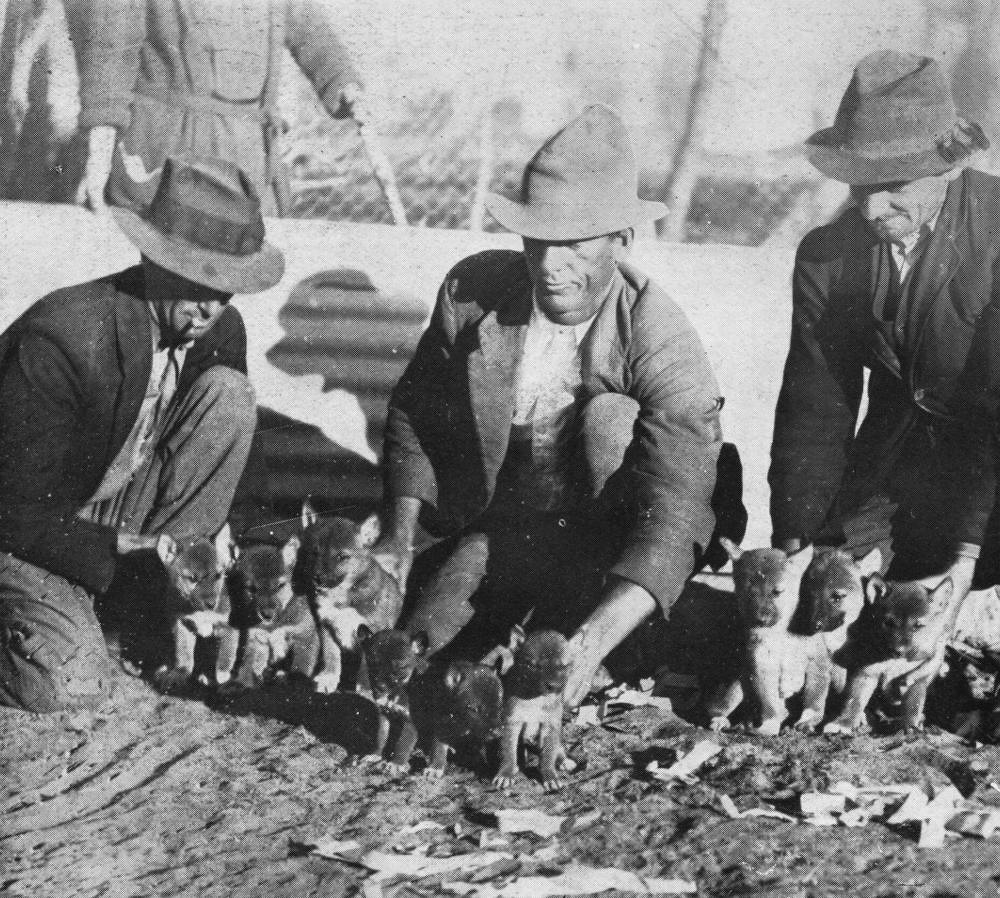 Doggers are people who are hired to kill dingoes and wild dogs. They shoot, poison and trap the animals and earned around $20 a head in the 1990s although problem animals sometimes had bounties as high as $500. Professional doggers can kill up to 200 dingoes a week. Dead dingoes are hung from fence post as trophies. Dingo killing became a way of making a living in 1830s when the Australian government placed a two shilling bounty on the head of each dingo killed. Mass shooting and poisoning campaigns were launched and sheep stations reported killing hundreds of dogs a year. Describing a dogger in action, Thomas O Neil wrote in National Geographic, "Up ahead we saw the dingo. It was standing in a trap, its eyes glazing from the prison. The dog, a yellow female, silently hung her head. Dean shot her and reset the trap. No sympathy. No remorse."