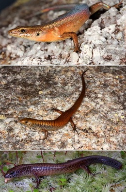Three new species of lizards discovered in Australia (from top to bottom): the Cape Melville Rainbow Skink (Carlia wundalthini), the Cape Melville Bar-lipped Skink (Glaphyromorphus othelarrni) and the McIlwraith Bar-lipped Skink (Glaphyromorphus nyanchupinta), images from Conrad Hoskin, Stephen Williams, Sci News