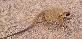 Central bearded dragons are opportunistic omnivores (animals that eat a variety of things, including plants and animals). They live in areas where food if often hard to find and this eat almost anything. Their stomachs are large to accommodate large quantities of plant matter. They also eat insects, and occasionally feed on small rodents or lizard. [Source: Jennifer Periat, Animal Diversity Web (ADW) |=|; Wikipedia]