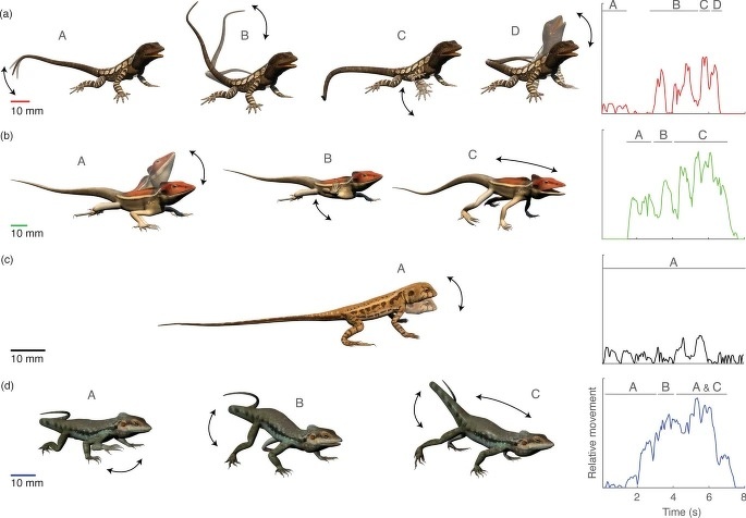 Display sequences of the four Australia lizard species; a) the Jacky dragon (Amphibolurus muricatus) starts with tail-flicks (A, B), followed by limb waves (C) and finishes with a whole body movement centred on a push-up (D); b) the long-snouted lashtail or long-nosed water dragon (Gowidon longirostris) has a series of head bobbing (A) and limb waving (B), the final push up is followed by a forward body thrust/rise (C); c) the Mallee dragon or Mallee sand-dragon (Ctenophorus fordi), is comparatively simple, and consists of rapid movement of the head up and down (head-bobbing, A); d) Tawny Dragon (Ctenophorus decresii) has several limb waves (A) and a distinct raising of the tail with a coil at the distal end of the tail (B), it finishes with a forward body thrust with tail coiled (C), from "Simulations with Australian dragon lizards" Nature