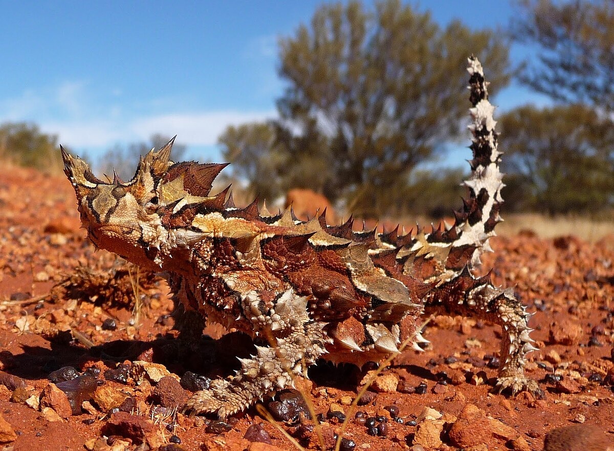 Thorny devils live in Australia’s hot, dry interior. Their spiny, armored exterior isn’t just for self-defense. It also helps the reptile capture moisture from condensation on its body. Thorny devils are slow moving and eats only ants. When alarmed they tuck their heads between their legs and off offers the thorny lump on their neck (a false head) to predators. Tiny channels in their necks direct rain and dew into their mouth.