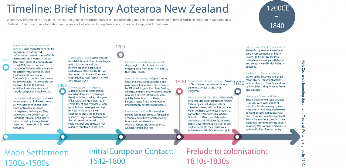 1840: Treaty of Waitangi between British Crown and several important Maori chiefs cedes some political powers to British but maintains indigenous rights in perpetuity.