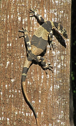 Lace monitors (Varanus varius) are also known as tree goannas. They are large monitor lizard that can reach two meters (6.6 feet) in total length and 14 kilograms (31 pounds) in weight. Lace monitors occur on the ground and in trees open and closed forests in eastern Australia, ranging from Cape Bedford on Cape York Peninsula to southeastern South Australia. They forage over relatively long distances — up to 3 kilometers (1.9 miles) a day — and are mainly active from September to May. When they are inactive in cooler weather they shelter in tree hollows or under fallen trees or large rocks. Lace monitors not endangered or threatened. They are designated as a species of least concern on the International Union for Conservation of Nature (IUCN) Red List. [Source: Wikipedia]