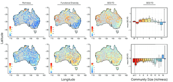 Maps of Australia showing patterns of richness (number of species) and functional diversity for monitor lizards (top row) and for monitor lizards and faunivorous marsupials together (bottom r row), with warmer colors indicating greater variety, from “Phylogenomics of monitor lizards and the role of competition in dictating body size disparity”, Researchgate
