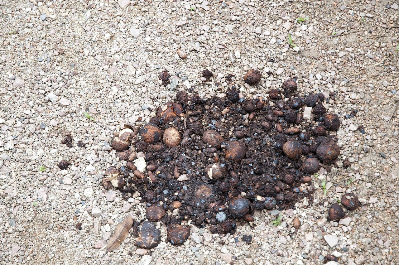 Cassowaries are important seed disperers for numerous plant species they eat. When cassowaries eat the fruit the seeds pass through their digestive system and are dispersed far from where they originally fell. The seeds are often still intact and viable after being digested and excreted by cassowaries. A typical pile of cassowary dung contains as much as one kilogram of seeds. One study identified from 78 plants species in cassowary scat and found that 70 of these species' seeds were able to germinate. These species included large number from the Lauraceae (laurel) family as well as mulberries (Moraceae), palms (Arecaceae), myrtles (Myrtaceae) and fruits listed above.