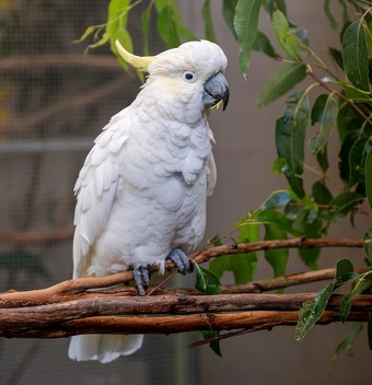 Cockatoos range in length from 30 to 60 centimeters (one to two feet) and weigh 0.3 to 1.2 kilograms (0.66 to 2.65 pounds), with the exception of cockatiel, which are considerably smaller and slimmer. The movable headcrest, which is present in all cockatoos, is striking in many species. It is raised when the birds land from flying or when they are aroused. Cockatoos share many features with other parrots, including the characteristic curved beak shape and zygodactyl feet mentioned above but differ in the presence of their erectile crest and their lack of the Dyck texture feather composition which causes the bright blues and greens seen in true parrots. [Source: Wikipedia]