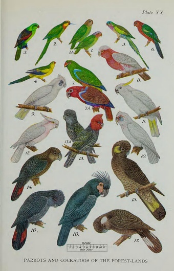 Some cockatoo and Australian parrot species: 1) red-cheeked parrot 2) superb parrot, 3) princess parrot, 4) regent parrot, 5) red-winged parrot, 6) king parrot, 7) red-sided parrot, 8) galah, 9) little correla, 10) corella, 11) white cockatoo, 12) pink cockatoo, 13) gang-gang cockatoo, 14) glossy black cockatoo, 15) yellow-tailed black cockatoo, 16) red-tailed black cockatoo, 17) white-tailed black cockatoo, 18) palm cockatoo