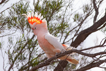Cockatoos are versatile feeders, eating range of mainly vegetable food items, including seeds, tubers, corms, fruit and flowers, as well as insects. They often feed in large flocks, particularly when ground-feeding. Seeds make up a large part of the diet of all species, and these are opened with their large and powerful bills. Galahs, corellas and some of the black cockatoos are primarily ground-feeders; others feed mostly in trees. The ground-feeders tend to forage in noisy squabbling groups where seeds are concentrated and dispersed lines where food is more sparsely distributed. They prefer open areas where visibility is good. Western and long-billed corellas have elongated bills that enable them to excavate tubers and roots. Pink cockatoo walks in a circle around the doublegee (Emex australis) to twist out and remove the underground parts.